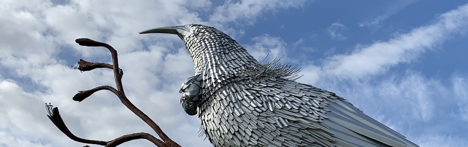 Steven Clothier is an artist who uses as a medium that many think of as a roofing material - corrugated iron. Starting with a pair of tin snips and hand riveter, Steven made 'The Dog' in Tirau in 1998 and just kept going. Beside it is now a ram's head, one of his many Creations featured in Tirau, and cementing his home town as the "Corrugated Iron Capital of the World".There are huge kiwis and a pukeko to greet you in Otorohanga, Ted the Rooster in Brisbane, a purple giraffe in Pukekohe, a fish playing a guitar in Matata, a giant pair of jandals in Whatawhata, a pukeko in Alaska and many many more Corrugated Creations throughout New Zealand and around the world.The Tirau 'Dog' I-site was a community project and the first time Steven had done anything artistic with iron. "You couldn't say I lacked for feedback," Steven said with a grin. "A lot of people were involved in the project so there were a lot of opinions flying around." With the help of local dairy farmer Tom Langlands, the facade was built with tin sips and a hand riveter within two months. The ' Dog' I-Site became a landmark.Since then, orders of all shapes and sizes have been fulfilled. Small, huge, flat, layered, curved and fully three dimensional. People ask for a wide range of things, for a wide range of reasons. That's what keeps it interesting. A Corrugated Creation is not restricted by shape or size - only by our imagination. Each one is unique. They become icons. Steven Clothier and his can-do attitude will tackle anything and over the years has pushed the boundaries of corrugated iron to new limits. The skill is in visualising the finished piece while engineering a supporting structure. "It's not like working with stone that leads you or clay which you can mould as you go," Steven said. "I have to work from the inside out."